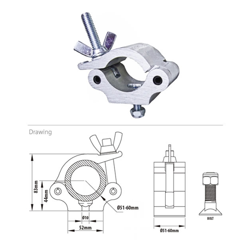 A captive on top of thread bolt to avoid wing nut falling off the clamp. Equipped with M10 countersunk square bolt and nylon lock nut. Ideal for stage, event, theater or studio.