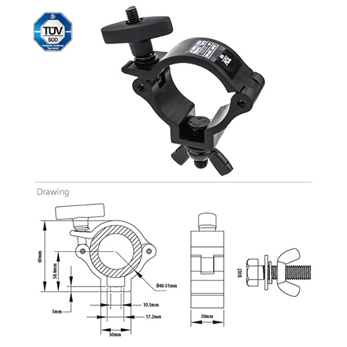 The Kupo Burger Coupler (KCP-901B) is made of high-strength tensile 6061-T6 extruded aluminum alloy, ensuring maximum durability. Its slim profile makes it an ideal choice for lightweight luminaires. The T-shape handle provides comfortable utility for users. Suitable for tube diameters of 48-51mm, it has a load capacity of 75kg and is TUV certified. Finished in black.