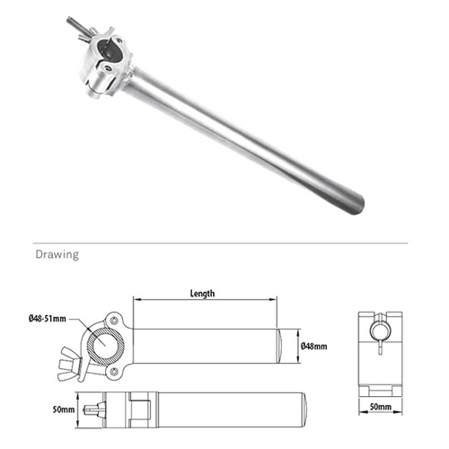 Arm coupler is firmly welded with 48mm aluminum alloy tube (length 250mm), creating an extension and flexible rigging point for lighting fixture. Max safety working load is 80kg. Feasible for tube diameter 48-51mm. Suitable for Stage, Theatre, Film, and Studio.