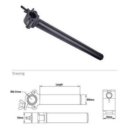 Arm coupler is firmly welded with 48mm aluminum alloy tube (length 250mm), creating an extension and flexible rigging point for lighting fixture. Max safety working load is 80kg. Feasible for tube diameter 48-51mm. Suitable for Stage, Theatre, Film, and Studio.