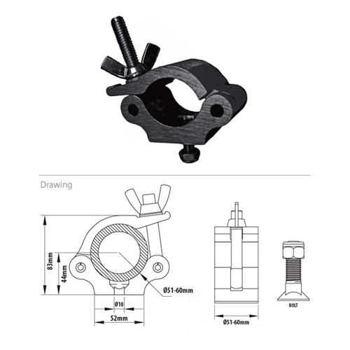 A captive on top of thread bolt to avoid wing nut falling off the clamp. Equipped with M10 countersunk square bolt and nylon lock nut. Ideal for stage, event, theater or studio.
