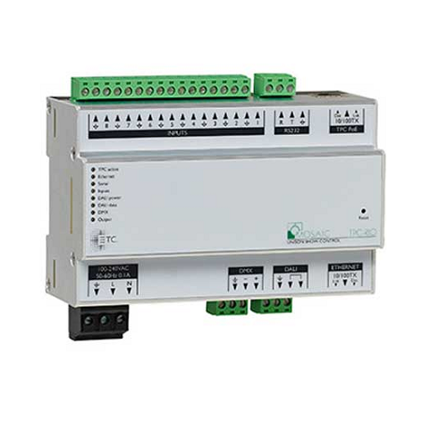 When DMX output is required, the TPC needs a way to convert Ethernet data to DMX. The TPC-RIO delivers all of the inputs and outputs needed for the controller, allowing the TPC to interface with a lighting control system via DMX. The versatile interface also provides connections for a DALI interface, eight contact closures and bidirectional RS232 serial, creating a standalone lighting-control system with no additional setup or wiring.