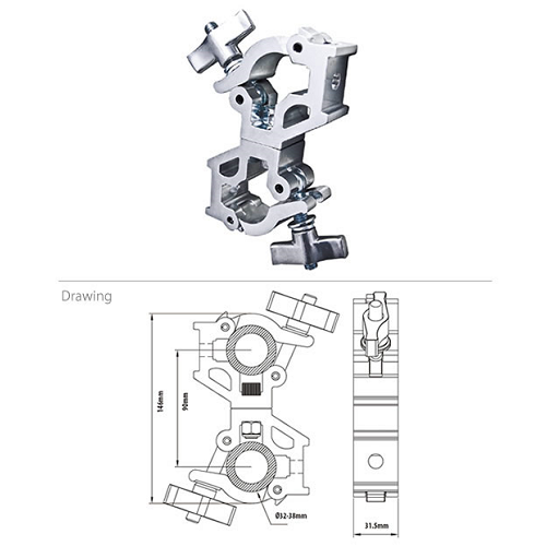 KUPO Nugget Swivel Coupler (KCP-862) is a lightweight and low profile professional coupler, constructed from high tensile aluminum extrusion. Working load limit is up to 120kgs. Nugget Coupler is designed to fit tubes with diameters between 32mm-38mm. For quick and easy interconnection for truss, pipes or bars.It has double level's counter sunk for M10 or 3/8" hex head. Unique windows for safety wire access through. Hook struct of top opening section limits the open pace that offers assistance to rig. A captive on top of thread bolt to avoid wing nut falling off the clamp. TUV certified, and ideal for TV studio or theater.