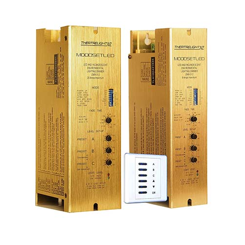 These new versions of Theatrelight's original Moodsets provide smooth dimming of both incandescent bulbs and leading edge mains dimmable LED bulbs. Applications include restaurants, hotel lobbies/ballrooms/chandeliers, museums and art galleries, theatre house lights, chicken sheds, and other industrial and horticultural uses requiring the smooth dimming of large numbers of LED bulbs.