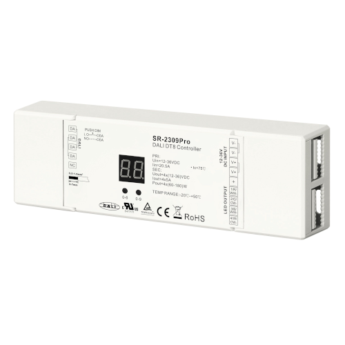 SR-2309PRO is a 4 in 1 DALI DT8 LED Controller which is in compliance with IEC 62386-101:2014, IEC 62386-102:2014, IEC 62386-207 Ed2, IEC 62386-209:2011. It is DALI DT8 device with built-in DALI-2 interface.