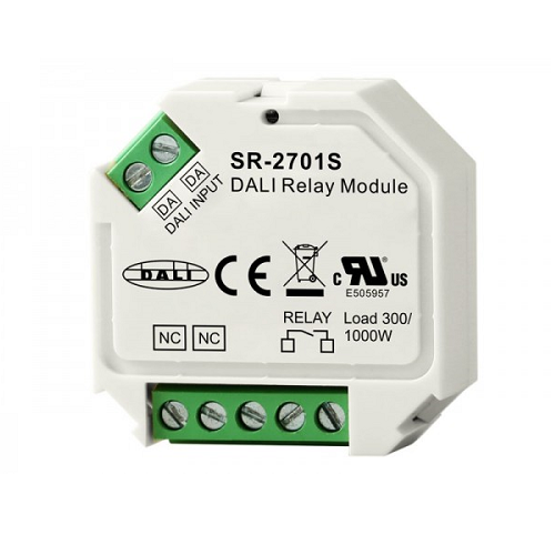 The SR-2701S is a DALI relay module which is capable of switching both AC and DC loads. The max. switching voltage for AC loads is 250V, and the max. switching voltage for DC loads is 30V. The DALI RM enables to integrate existing loads which do not have DALI input into DALI circuit and switch on/off the loads.