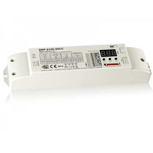 SRP-2106-50CC is a 50w dimmable DMX LED driver with 1 channel constant current output and adjustable current from 250ma to 1500ma by DIP switches, which enables it to be suitable for LED lights with different current. It is designed with 200-240VAC input. Power factor of the driver can be over 0.9 and efficiency is higher than 87%. It enables smooth and deep dimming to 0.1% without flickering and buzzing noise. DMX address can be manually assigned via buttons and showed on digital display. Complying with DMX512(2008) and DMX512-A, this LED driver is compatible with universal DMX master controllers.