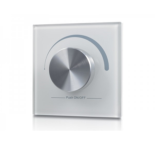 0-10V LED dimmer switch SR-2202-1-10V is a single color rotary dimmer controller designed with sleek compact appearance and high strength tempered glass material. The rotary dimmer switch adopts popular and mature 1-10V signal control which offers both switch and smooth brightness dimming functions for single zone. Designed with user-friendly interface and rotary knob, it is easy to switch on/off lights by click the rotary switch and dim brightness by rotating the rotary dimmer. Smooth dimming from 0.1%-100% without any flickering can be very comfortable for human eyes. Compatible with SR-2001 series 0/1-10V signal receivers that are available in both constant voltage and constant current version, the rotary dimmer switch can control different types of LED lightings.
