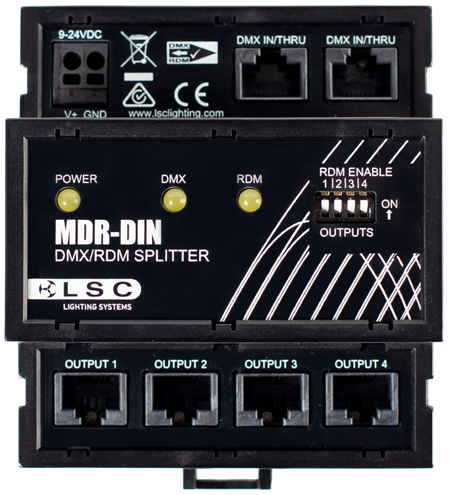 Based on LSC’s popular MDR range of professional DMX512/RDM splitters, the MDR-DIN has been specifically designed for the permanent installation market. Utilizing the industry standard DIN-rail mounting concept, the MDR-DIN provides four isolated outputs in a convenient compact package.