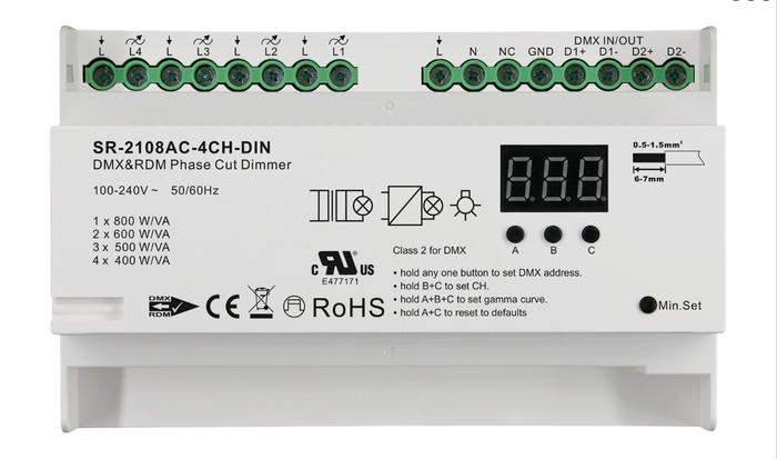 The Sunricher SR-2108AC-4CH-DIN is a professional 4-channel DMX512 phase-cut dimmer designed for controlling mains-powered lighting loads in entertainment and architectural environments. Built for DIN rail installation, it provides a reliable solution for integrating phase-dimmable LED, halogen, and incandescent lighting into DMX-based control systems.