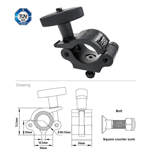 The load can be Up to 500 kg, the suitable pipe diameter is 48~51mm, and it has passed the German TUV safety certification. The butterfly knob provides a good force point for both hands, and it can be locked firmly without additional tools.
