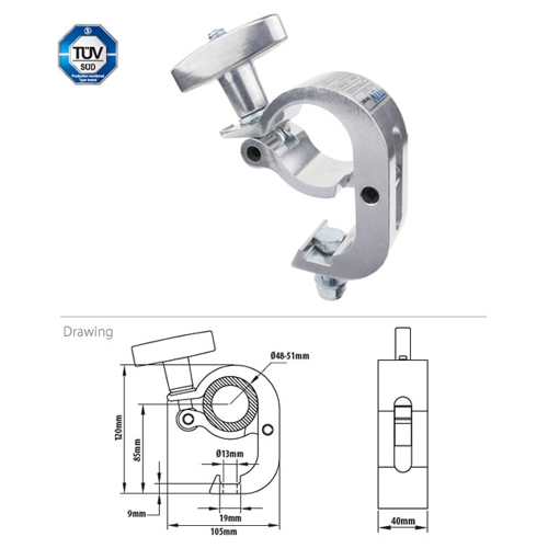 - TUV approval Thanks to a triggering mechanical design, this clamp is made to help rig heavy luminaries quickly and effortlessly